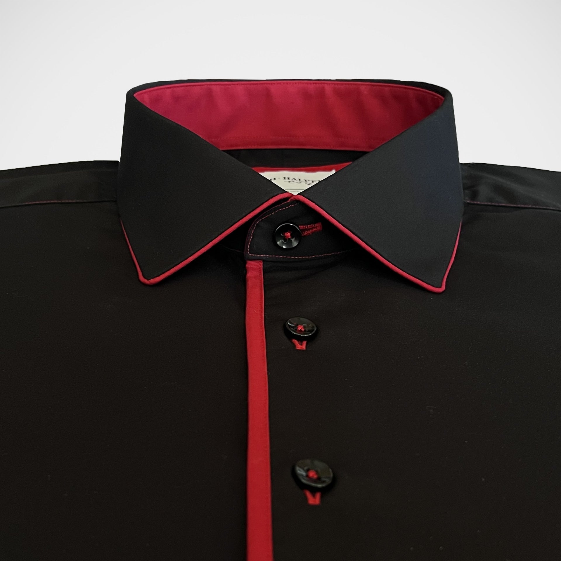 Made To Order. H. HALPERN ESQ. 'Black and Red Friday' Dress Shirt. Dramatic Black shirt with red piping and trim on the collar and cuffs, and down the front button placket. Red stitching throughout the shirt. Made in Canada exclusively for H. HALPERN ESQ. 100% cotton.