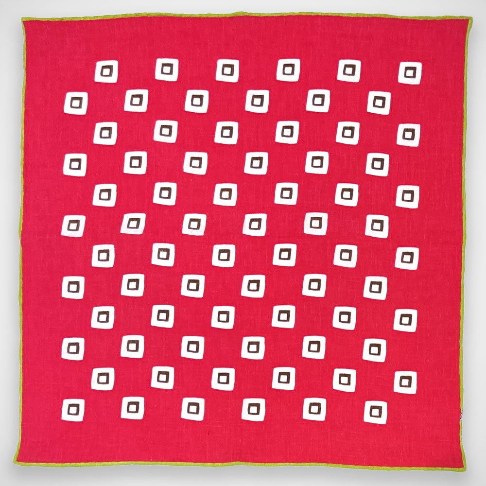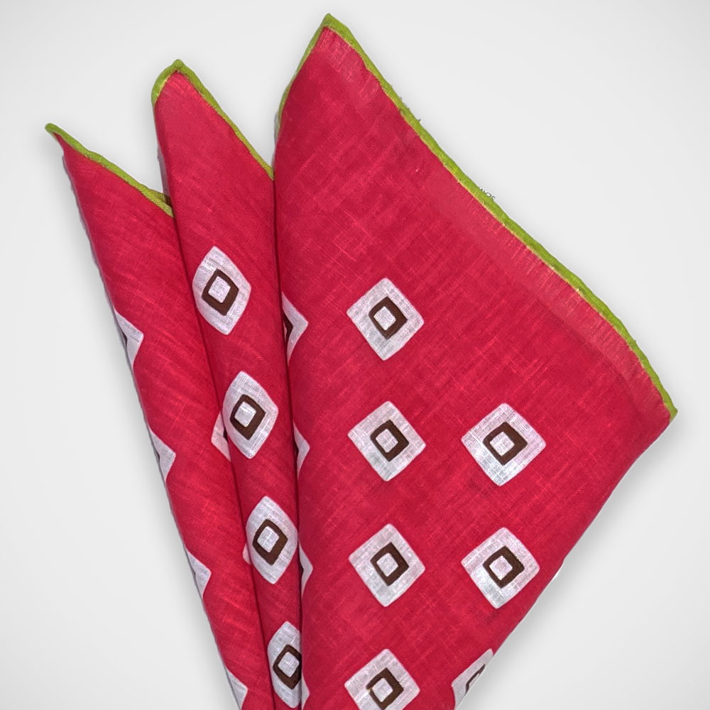Seaward & Stearn 'Fuchsia Linen' Pocket Square. Fuchsia 16" square with brown neat design and lime green trim. 100% linen. Made in England.