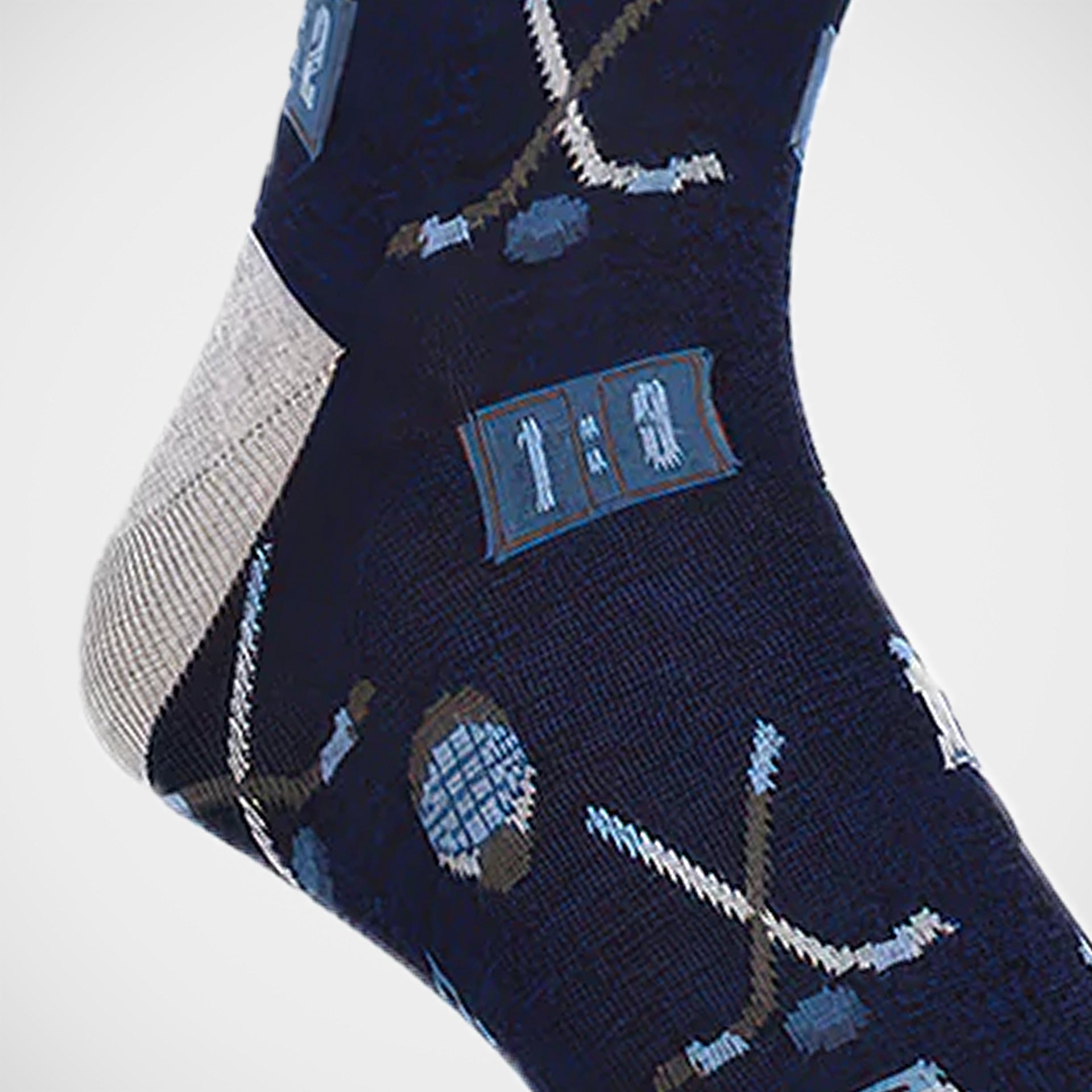 Dion ''Good Ol' Hockey Game Navy' Socks. Grey and blue hockey sticks, helmets and skates on Navy. 80% mercerized cotton, 20% nylon. Made in Greece. One size fits most
