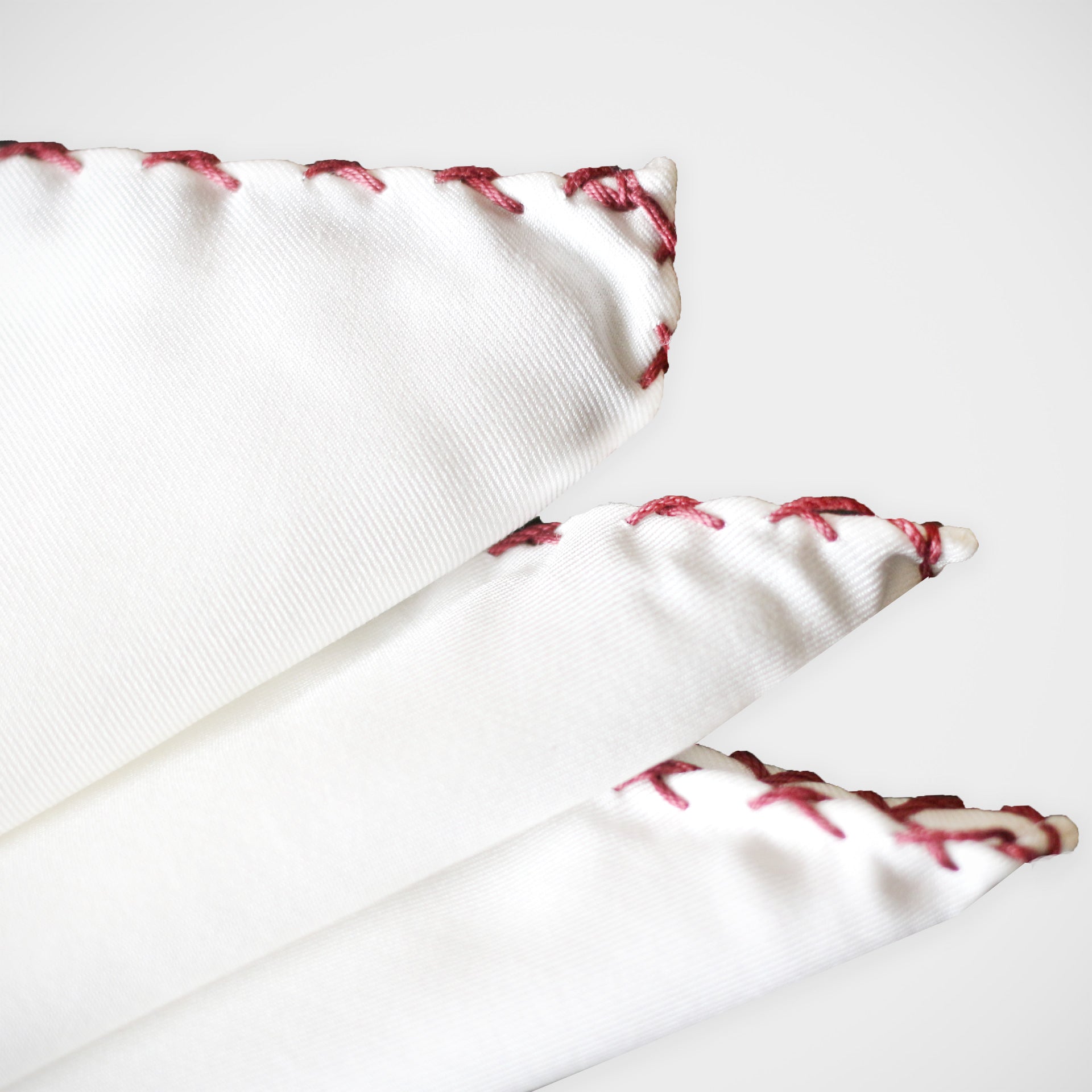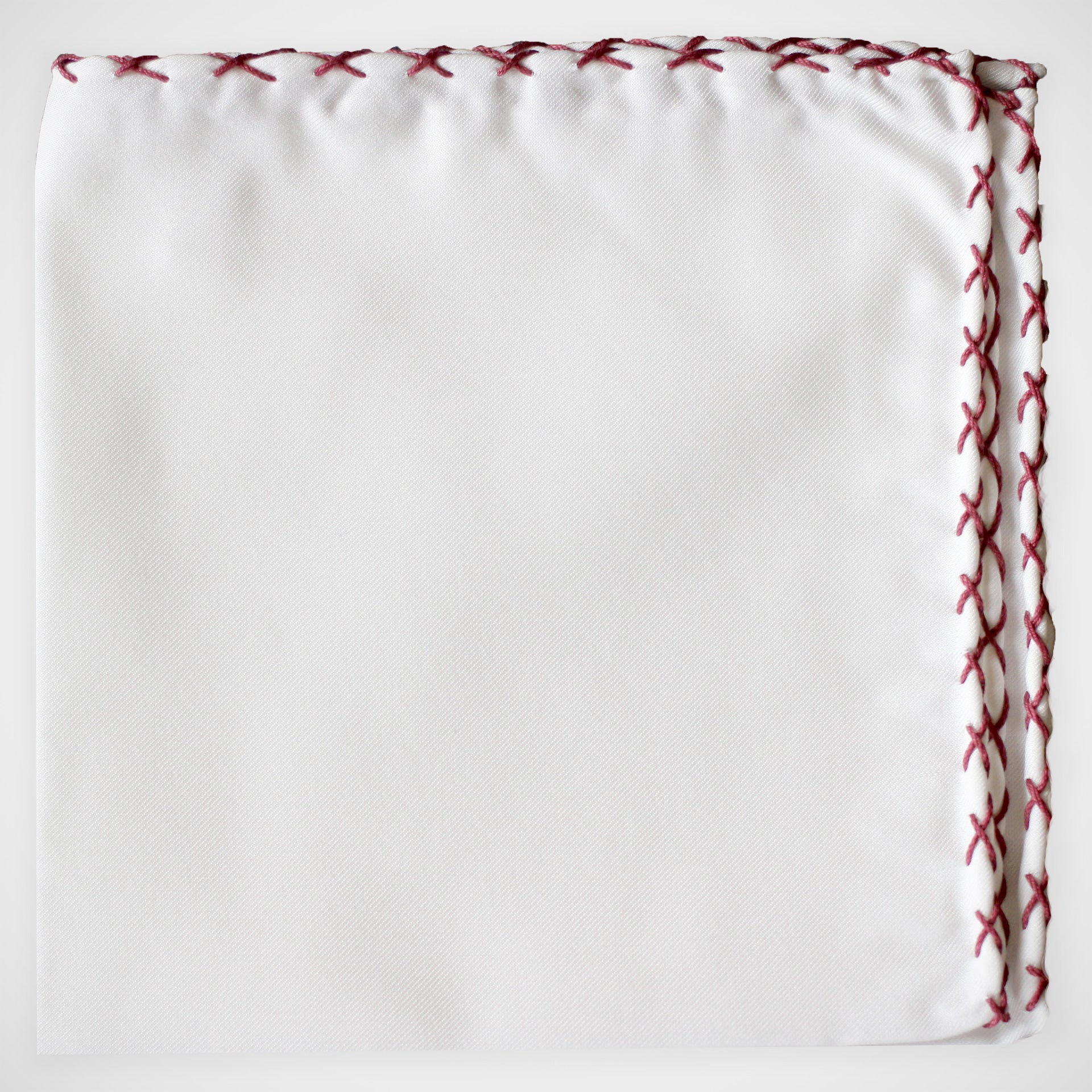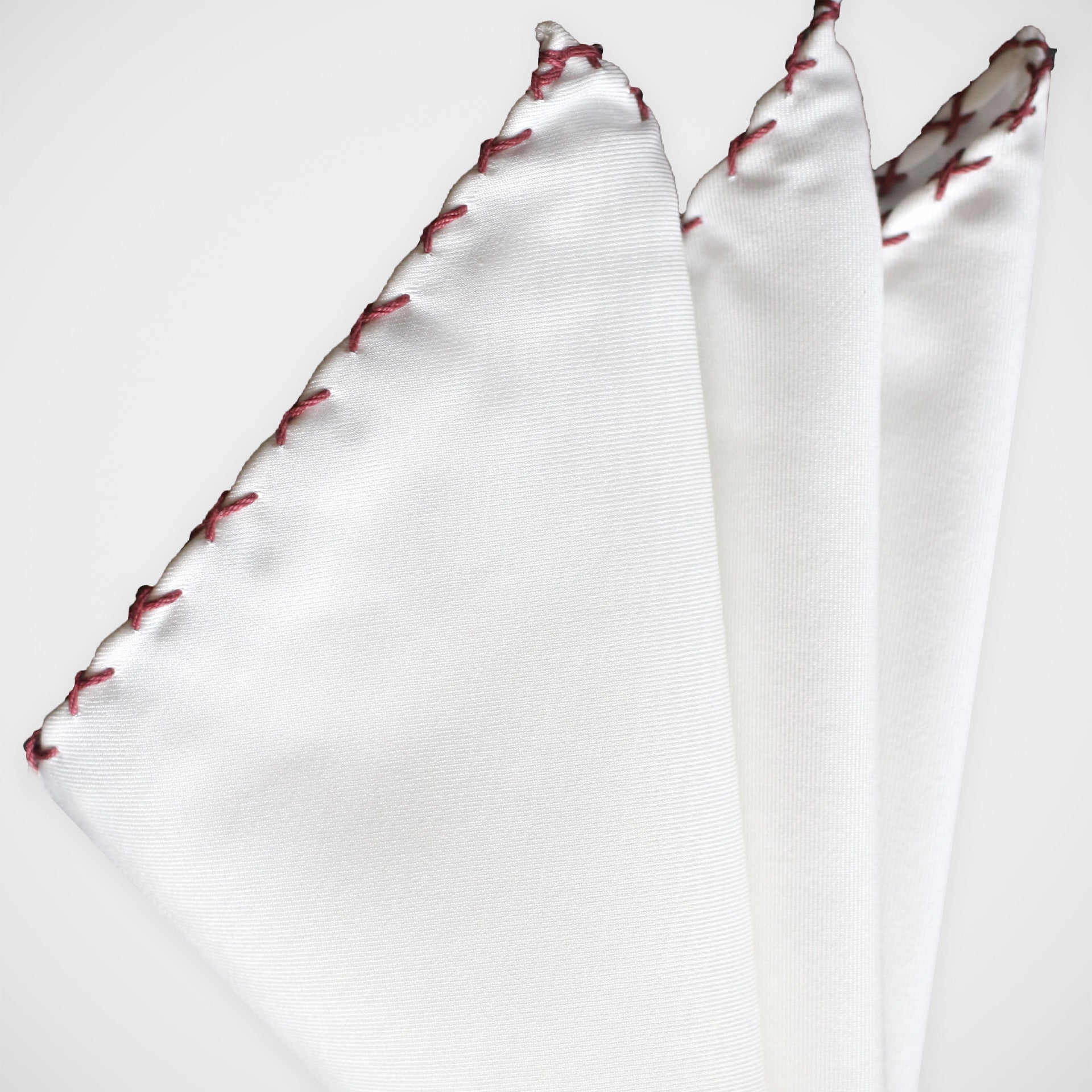 Geoff Nicholson 'Hand-stitched in Burgundy' Pocket Square. White pocket square with hand-stitched edge. 40% Silk 60% Cotton. Made in Italy.