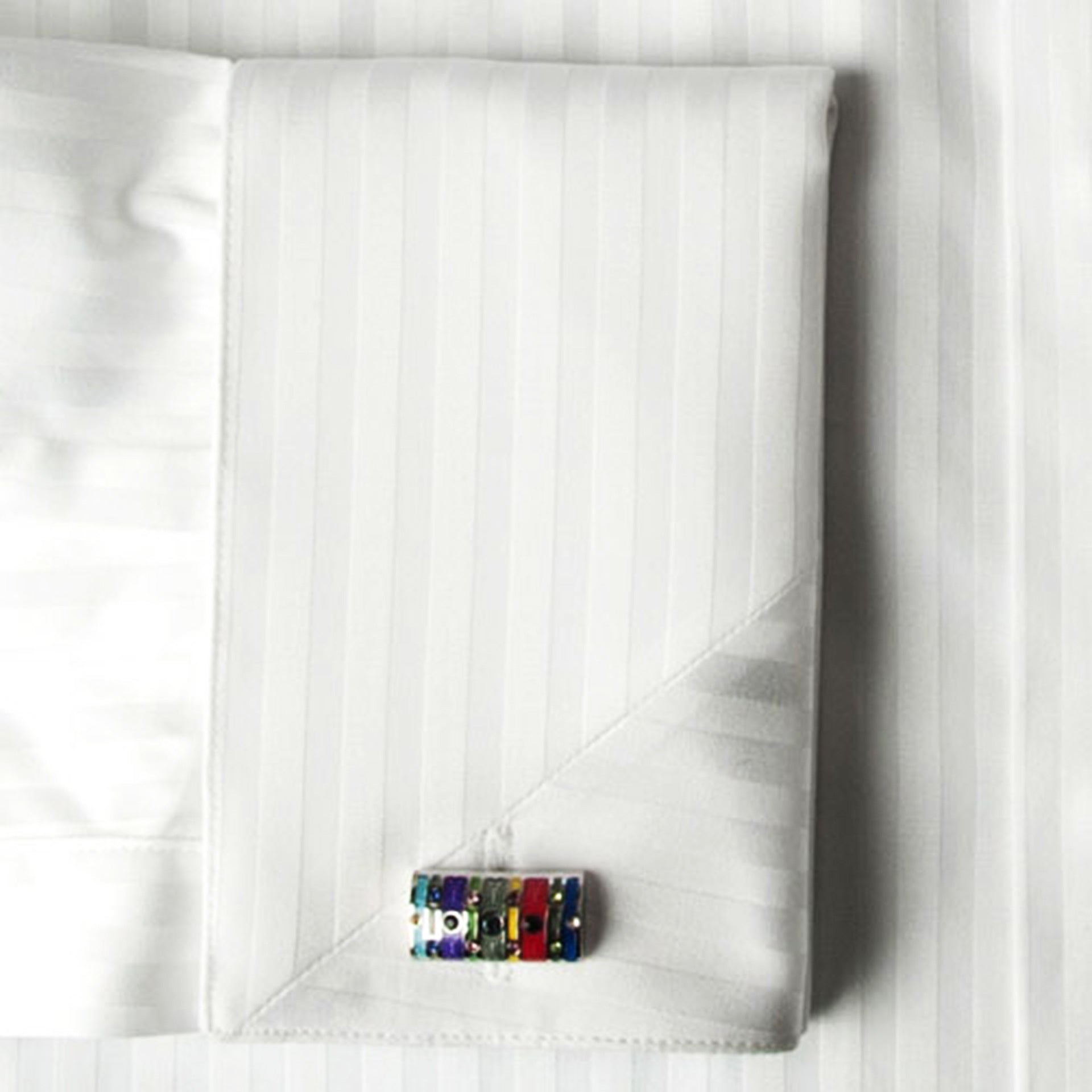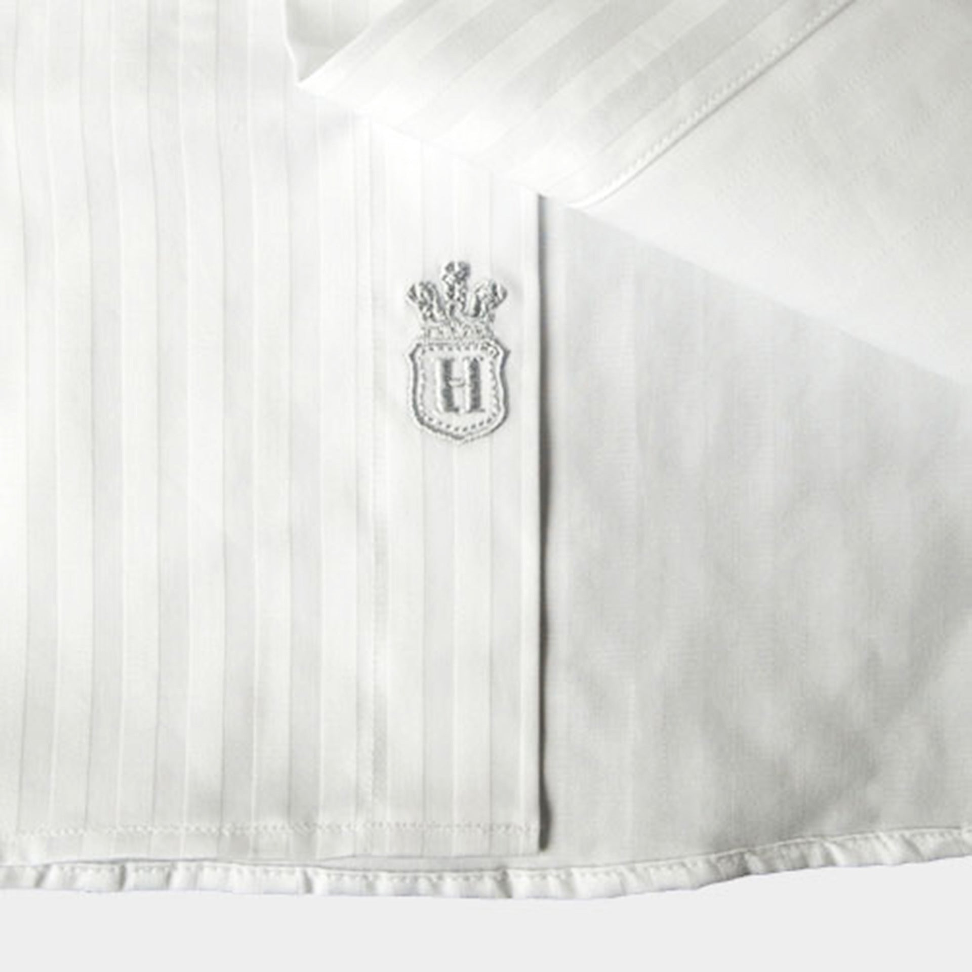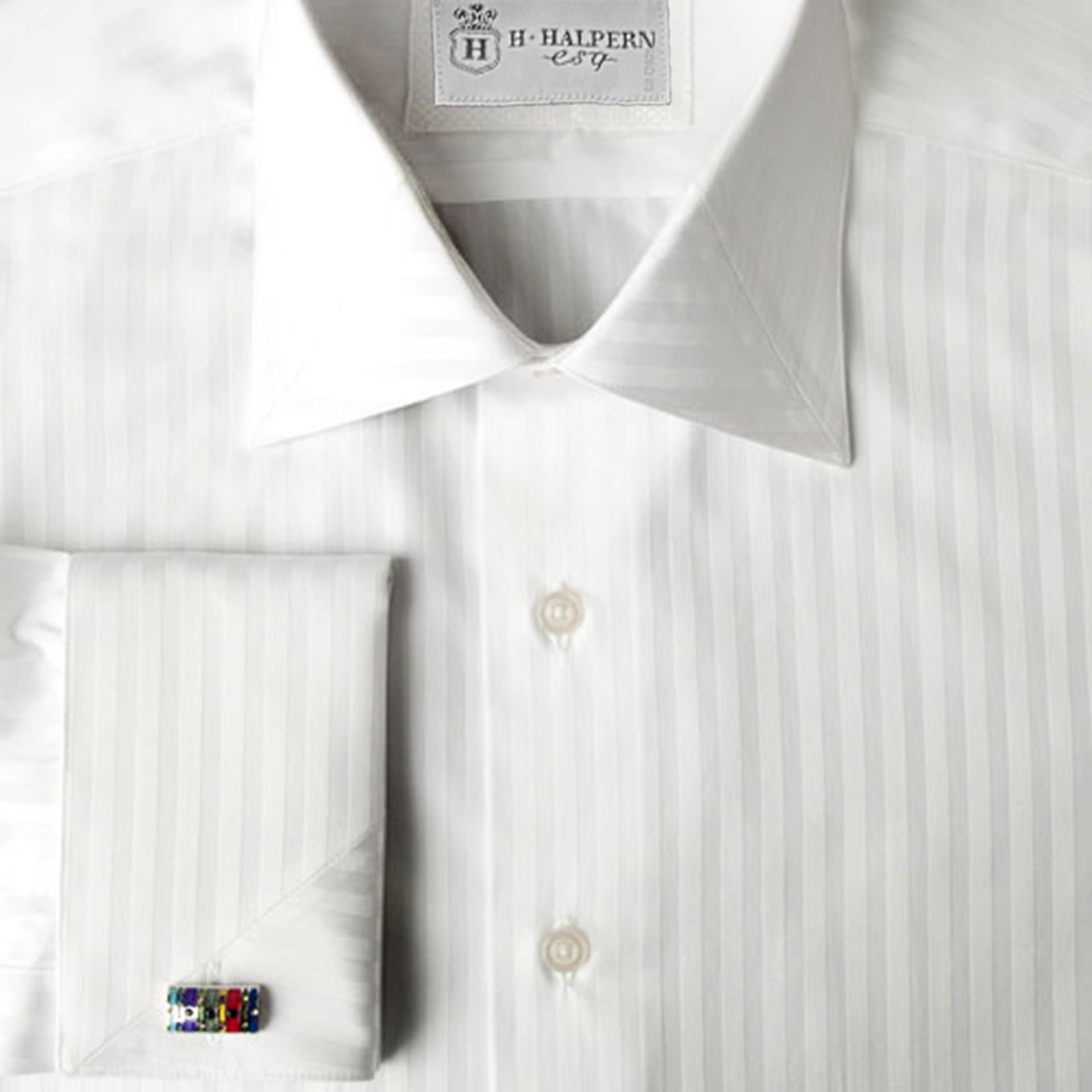 MADE TO ORDER H. HALPERN ESQ. 'Mitered White on White' Dress Shirt. White Bengal satin stripe with mitered detail on the collar and French cuffs. Also available with button cuffs. Made in Canada exclusively for H. HALPERN ESQ. 100% cotton.