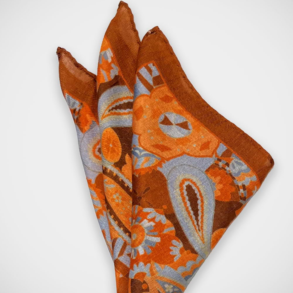 Tino Cosma 'Orange and Grey Floral' Pocket Square. Floral in rust, orange and a blue grey. 12" square. Luxurious feel made of 90% Modal, 10% Cashmere. Made in Italy.