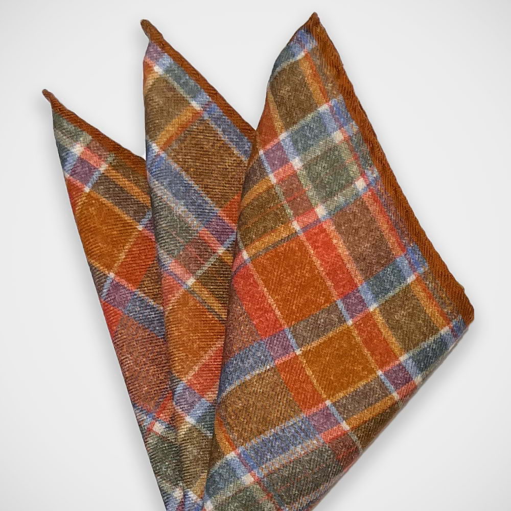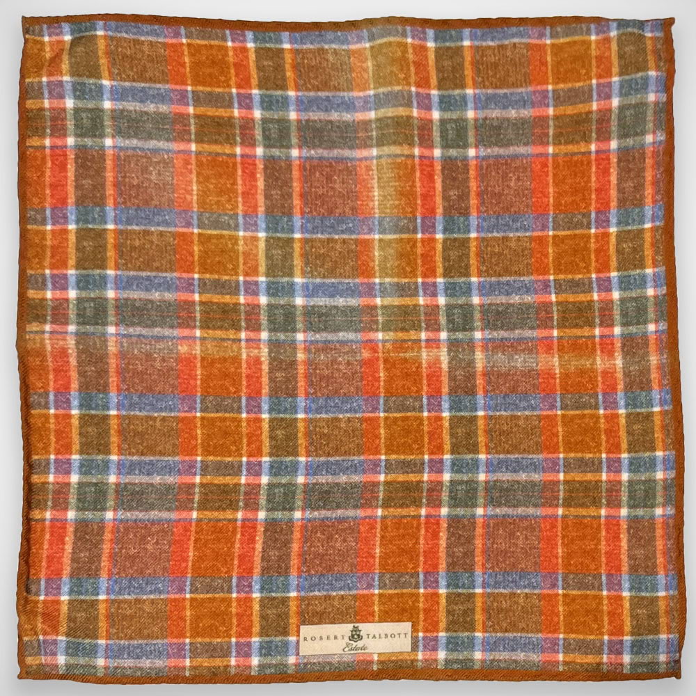Robert Talbott 'Orange Plaid' Pocket Square. Rich rusty orange with blue and green overcheck. 100% Wool.