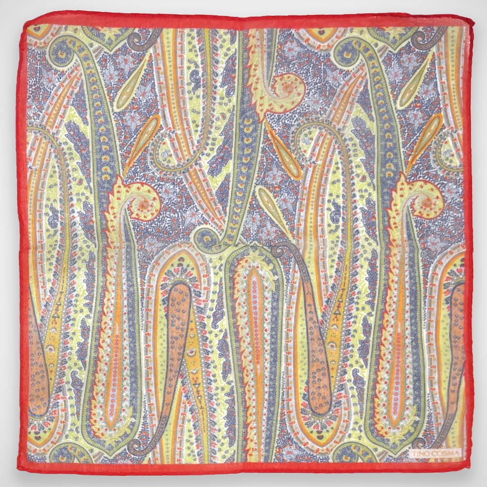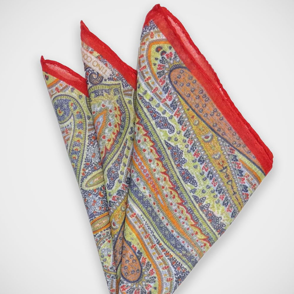 Tino Cosma 'Green Paisley' Pocket Square. Unique paisley in shades of green, gold, orange and navy with rust trim. 12" square. 100% Cotton voile. Made in Italy.